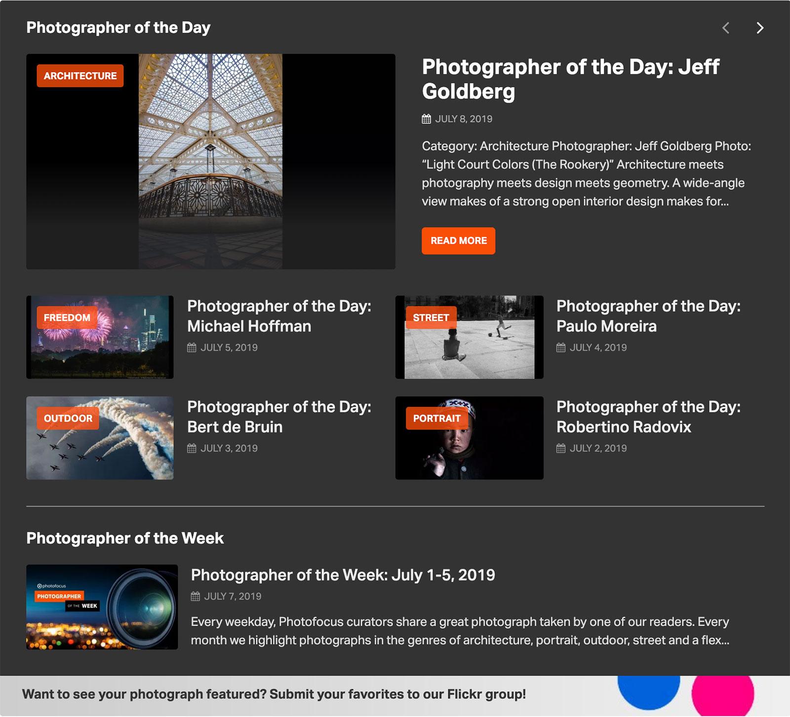 Underneath our email sign-up area, you’ll also see a brand-new Photographer of the Day feature. You’ll be able to see our latest five featured photographs, but also use the arrows at the top of the section to see past POTD selections.
